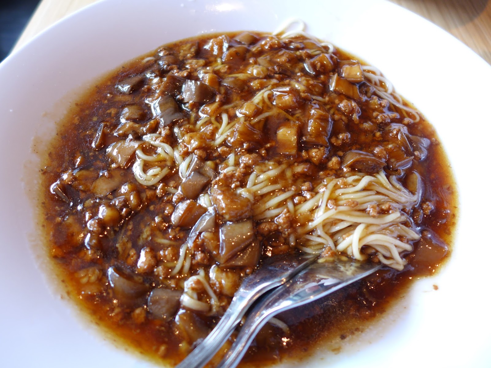"Pigplant" stew with minced pork, stewed eggplant, scallions and noodles.